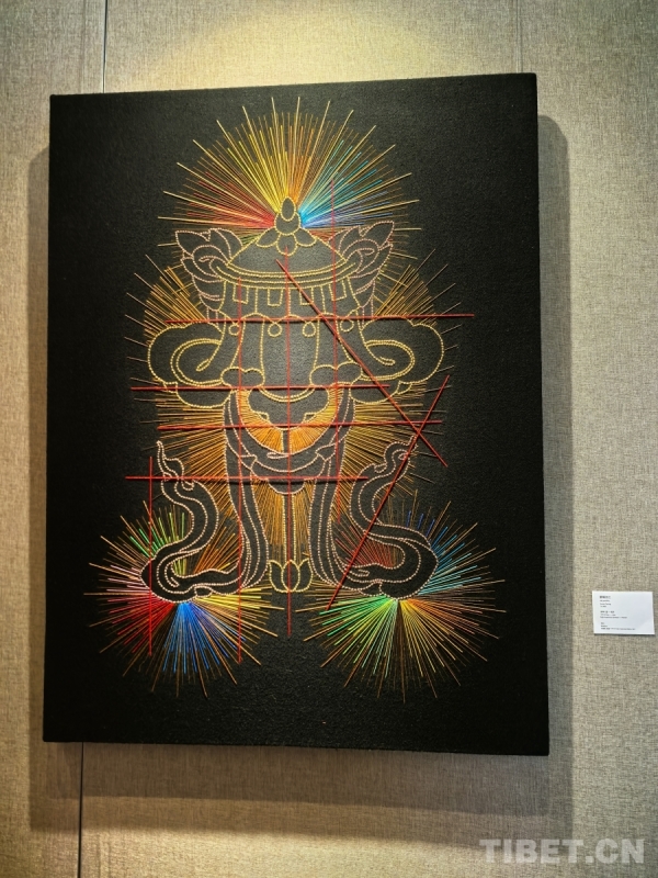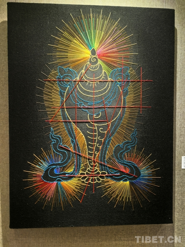 索喃次仁的作品慣以手工羊絨布為面,彩色羊毛線為語言,呈現(xiàn)標志性的“彩虹”元素?!埃ㄎ鞑兀﹤鹘y(tǒng)的藝術(shù)是有一定標準的,而當(dāng)代藝術(shù)是可以無界的,包括材質(zhì)、材料都可以有所創(chuàng)新,是表達個人情感和生活的一種藝術(shù)形式。我常常問自己,能不能突破傳統(tǒng)?可不可以做一些比較新的東西?像我現(xiàn)在創(chuàng)作選擇用羊絨布,就是我的一種情感表達,因為(它)與我的家鄉(xiāng)有深切關(guān)系?!彼鬣稳式忉尩?/span>:“比如說這一幅作品,佛像外呈現(xiàn)出一種彩虹的狀態(tài)。因為彩虹本身是一個無常的現(xiàn)象,而我之前學(xué)過唐卡佛像,所以把佛像和彩虹理念結(jié)合了,這既是一種傳承,也是突破。”
