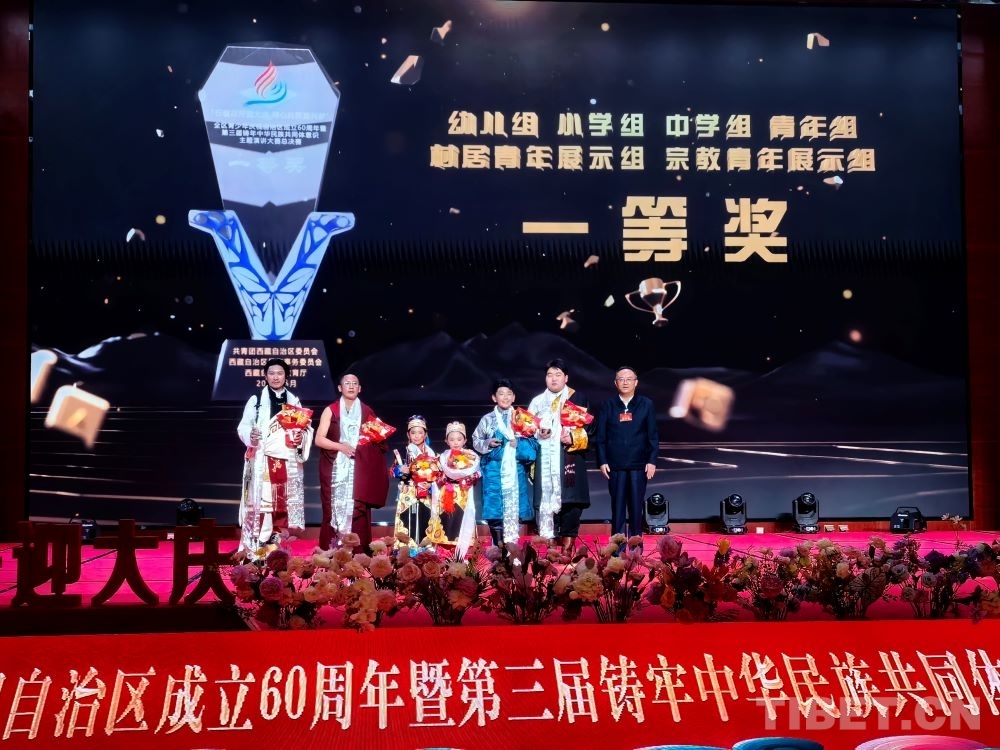 圖為第三屆西藏青少年鑄牢中華民族共同體意識(shí)主題演講大賽總決賽暨頒獎(jiǎng)典禮上,一等獎(jiǎng)?lì)C獎(jiǎng)現(xiàn)場(chǎng) 攝影:王淑