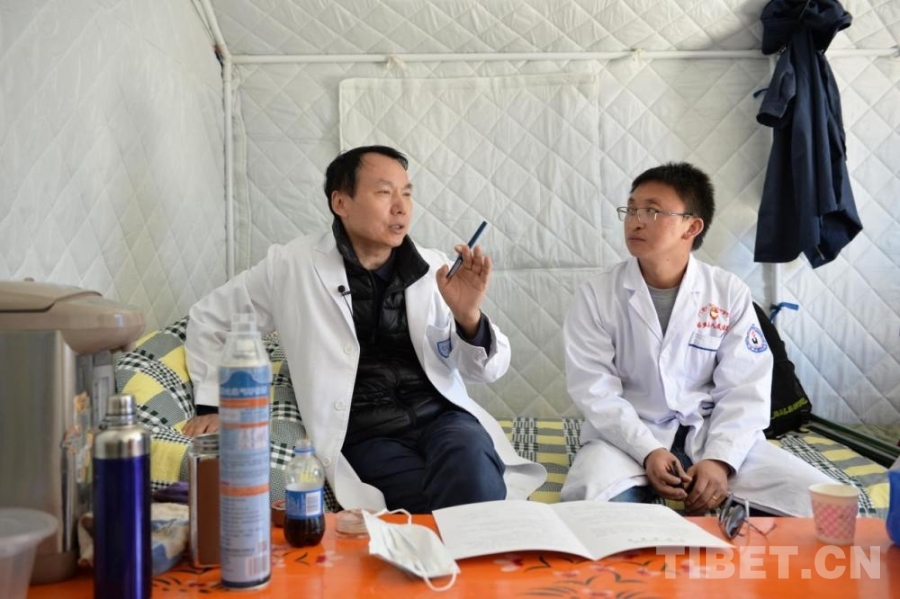 圖為2021年,余震中,王建六(左)帶領團隊赴青海省瑪多縣開展宮頸癌篩查,在帳篷辦公室里與當地醫(yī)務工作者交流 北京同心共鑄公益基金會供圖