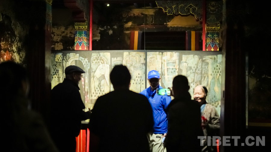 此次展覽中,策展人以“藏地傳統(tǒng)的當(dāng)代轉(zhuǎn)化”為主線,梳理上述不同系列作品,完整呈現(xiàn)出藝術(shù)家的創(chuàng)作脈絡(luò)。展覽標(biāo)題“夢瑜伽”,來自《黑經(jīng)書》系列作品的創(chuàng)作故事,清代壁畫環(huán)繞的獨(dú)特古建場域與《黑經(jīng)書》系列作品于光影間輝映,共同營造出西藏藝術(shù)歷史與當(dāng)下交錯的鏡像,在搭建橋梁、連結(jié)傳統(tǒng)與時代精神的同時,也引領(lǐng)觀眾走入高強(qiáng)度的精神性探索。