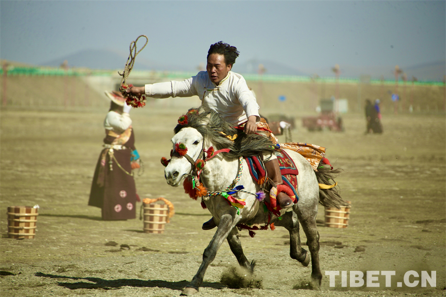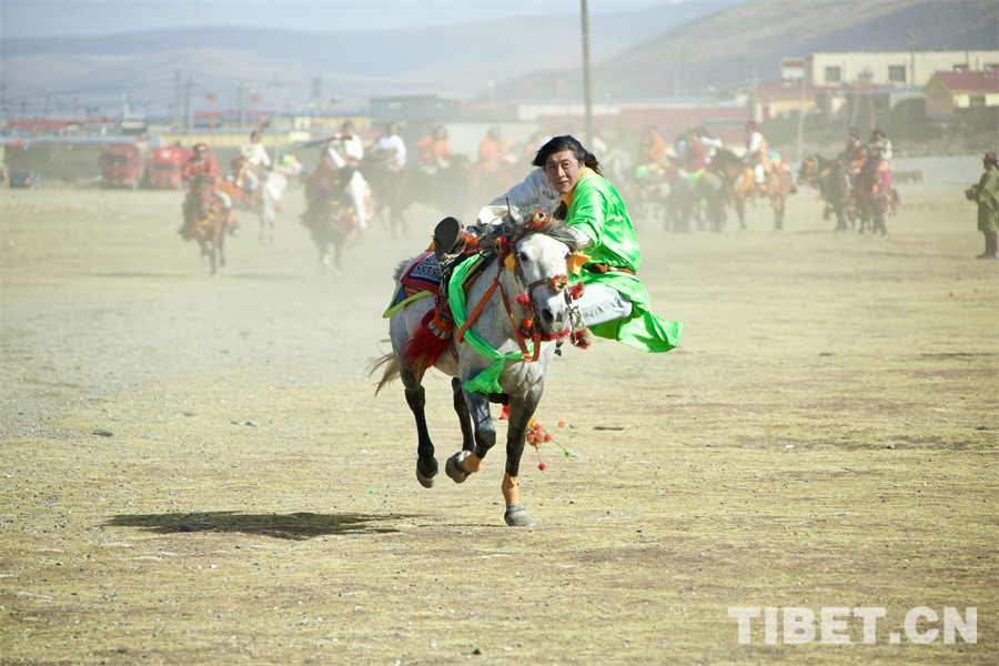 在海拔4000米左右的遼闊天地間,康巴漢子們駕馭著矯健的駿馬、身著華美的傳統(tǒng)服飾,如疾風(fēng)般掠過金色的草原,在馬背上展示跑馬射箭、乘馬射擊、跑馬拾哈達、跑馬倒立、跑馬懸體等高難度動作,馬蹄聲聲、歡呼陣陣,交織成高原最豪邁的樂章。(中國西藏網(wǎng) 記者/畢然 龍真多吉)