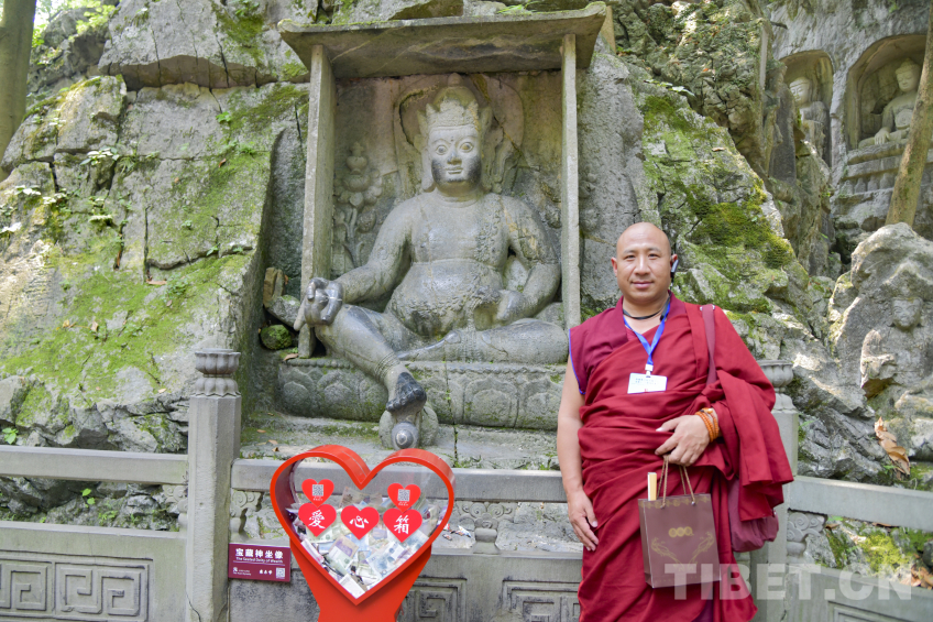 “雖然我已經(jīng)在飛來峰講解了許多年,但始終不知道這尊藏傳佛教財(cái)神爺在藏語中的發(fā)音怎么讀,今天有幸向各位請(qǐng)教。”在靈隱寺飛來峰的理公塔旁,一處坐南朝北、呈縱長形的佛龕內(nèi)供奉著一尊菩薩坐像,這是元代所雕刻出的藏傳佛教黃財(cái)神造像。隨團(tuán)導(dǎo)游小李正趁此機(jī)會(huì)向來自西藏的師生們請(qǐng)教,來自西藏的他們亦同樣為在杭州能看到如此大規(guī)模的藏傳佛教造像感到驚訝。