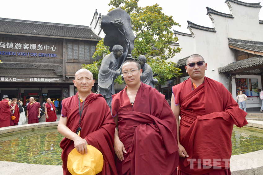 圖為在烏鎮(zhèn)西柵景區(qū)寒山拾得雕塑前西藏佛學院師生留下合影 攝影:趙振宇