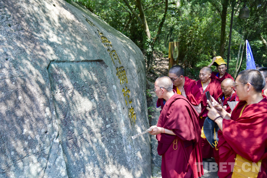 圖為西藏佛學院師生被普陀山西天景區(qū)藏文雕刻所吸引 攝影:趙振宇