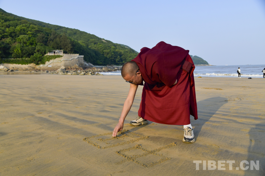 圖為西藏佛學院學員在東海岸邊寫下中國二字 攝影:趙振宇
