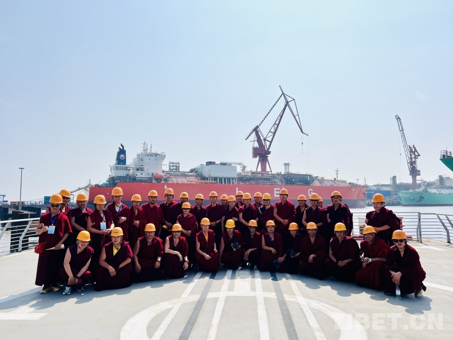 圖為西藏佛學(xué)院師生在上海江南造船廠合影,近距離接觸中國制造的先進(jìn)液化乙烯(LEG)運(yùn)輸船 攝影:趙振宇