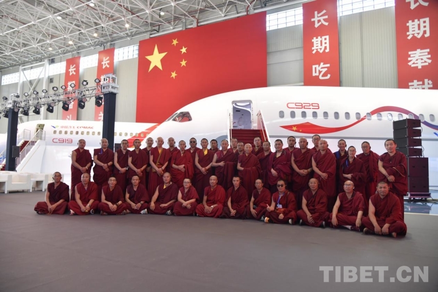 圖為西藏佛學(xué)院師生在中國商飛公司展廳合影,了解中國高端制造“新名片”的發(fā)展 攝影:趙振宇
