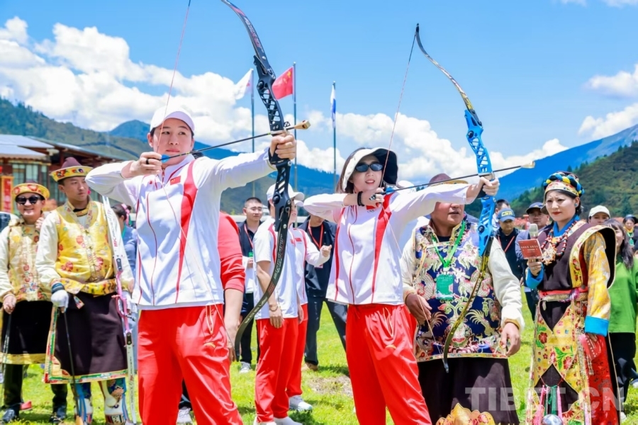 圖為奧運冠軍同當?shù)卮迕褚煌w驗西藏傳統(tǒng)體育項目工布響箭