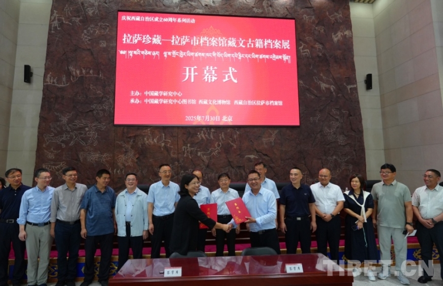 本次展覽由中國(guó)藏學(xué)研究中心主辦,中國(guó)藏學(xué)研究中心圖書(shū)館、西藏文化博物館和西藏自治區(qū)拉薩市檔案館共同承辦。開(kāi)幕式上,中國(guó)藏學(xué)研究中心圖書(shū)館與拉薩市檔案館簽署《藏文古籍檔案文獻(xiàn)數(shù)據(jù)共享與開(kāi)發(fā)利用合作協(xié)議》。(中國(guó)西藏網(wǎng) 記者/周晶)