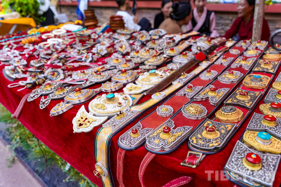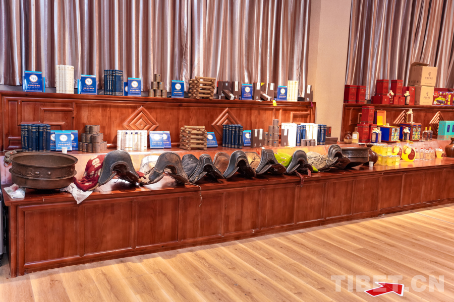 圖為展區(qū)內(nèi)擺放的各種藏香、馬鞍、器皿以及農(nóng)特產(chǎn)品