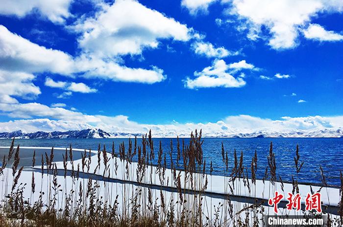 2018年10月14日在青海省瑪多縣拍攝的雪后黃河源頭的湖泊在藍天的照映下,如同寶石一般。中新社記者 孫睿 攝