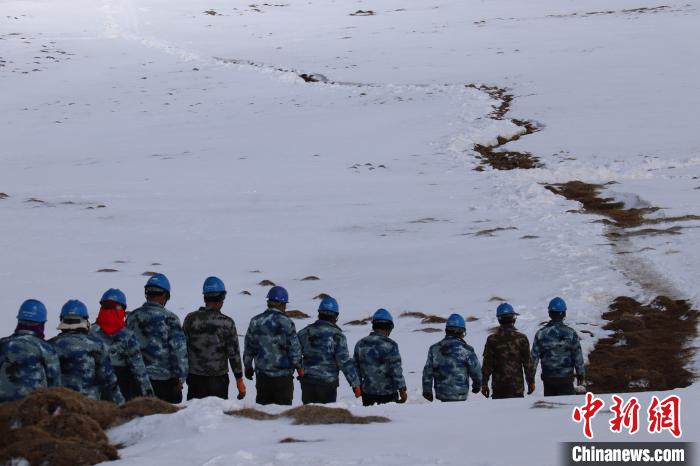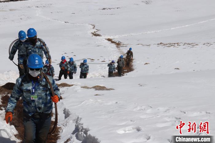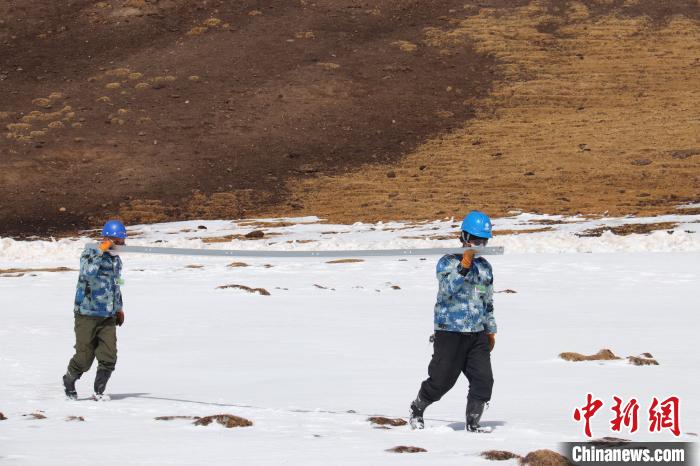 青海省玉樹藏族自治州稱多縣境內(nèi)的覺頂山山頂海拔5310米,“三區(qū)兩州”玉樹地區(qū)電網(wǎng)工程建設(shè)稱多110千伏輸變電二回線路將在這里組立一基鐵塔。4月10日,天剛蒙蒙亮,項目負(fù)責(zé)人韓建青便帶著施工隊徒步趕向位于半山腰的塔基處。積雪已經(jīng)淹沒了腳踝,一腳踩下去,能清晰的感受到冰雪觸及皮膚帶來的刺痛?!耙氲竭_(dá)塔基處可不容易啊,看到我們背的鐵鍬了嗎,那不是挖地的,那是開路用的?!蹦杲?0歲的韓建青氣喘吁吁地說。