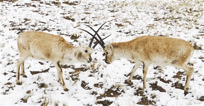 站在離它們不遠的地方,相互平靜地對視,許久,一只小藏羚羊才走上前來,把臉慢慢靠近蹲在地上的才仁多杰的面頰。
