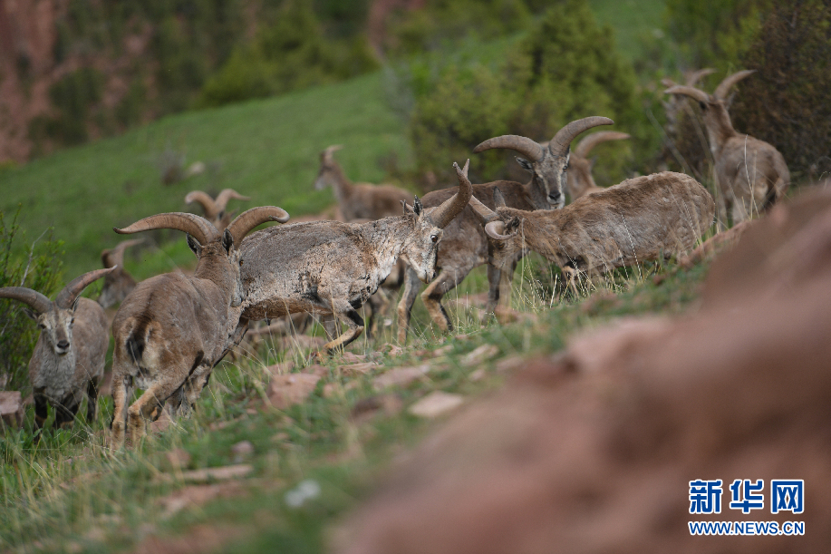 一群巖羊在青海省玉樹藏族自治州囊謙縣吉尼賽鄉(xiāng)河谷的山坡上嬉戲。(6月20日攝)新華網(wǎng) 潘彬彬 攝