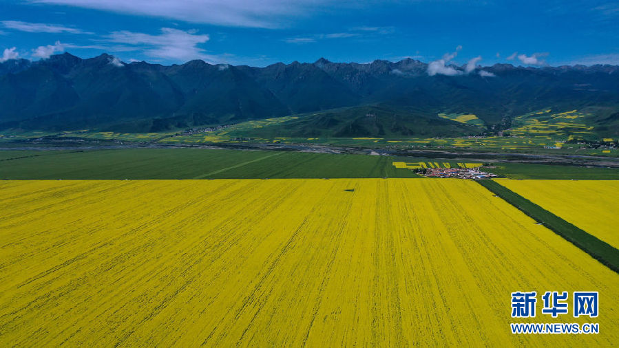 這是7月22日拍攝的門源回族自治縣境內(nèi)的油菜花田(無人機(jī)照片)。新華社記者 吳剛 攝