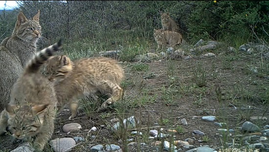 荒漠貓為中國(guó)所有貓科動(dòng)物中僅有的特有物種,《世界自然保護(hù)聯(lián)盟》(IUCN)瀕危(EN)物種,荒漠貓?jiān)谌珖?guó)數(shù)量稀少,分布密度低,對(duì)其生活史所知甚少。其通常棲息于海拔2500米至5000米干燥的高山與亞高山灌叢、戈壁、草甸生境中。自祁連山國(guó)家公園青海省管理局啟動(dòng)荒漠貓專項(xiàng)調(diào)查以來(lái),在國(guó)家公園范圍內(nèi)頻繁記錄到荒漠貓活動(dòng)畫面,并且記錄到一只雌性荒漠貓成功撫育4只幼崽的畫面,監(jiān)測(cè)到5只荒漠貓同框的罕見(jiàn)畫面。祁連山國(guó)家公園青海片區(qū)自開(kāi)展貓科動(dòng)物專項(xiàng)調(diào)查以來(lái),記錄到5只雪豹同框、6只兔猻同框的罕見(jiàn)畫面后又一次記錄到貓科動(dòng)物多只同框的畫面。