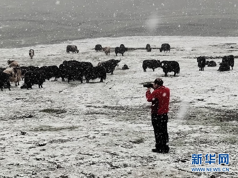 趙新全在青海省玉樹(shù)藏族自治州曲麻萊縣拍攝牦牛影像資料(2019年6月28日手機(jī)拍攝)。 新華社發(fā)