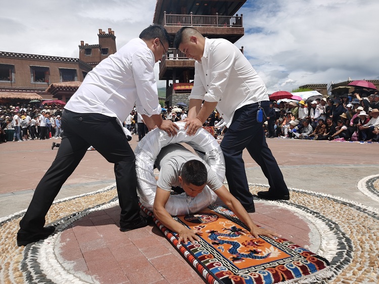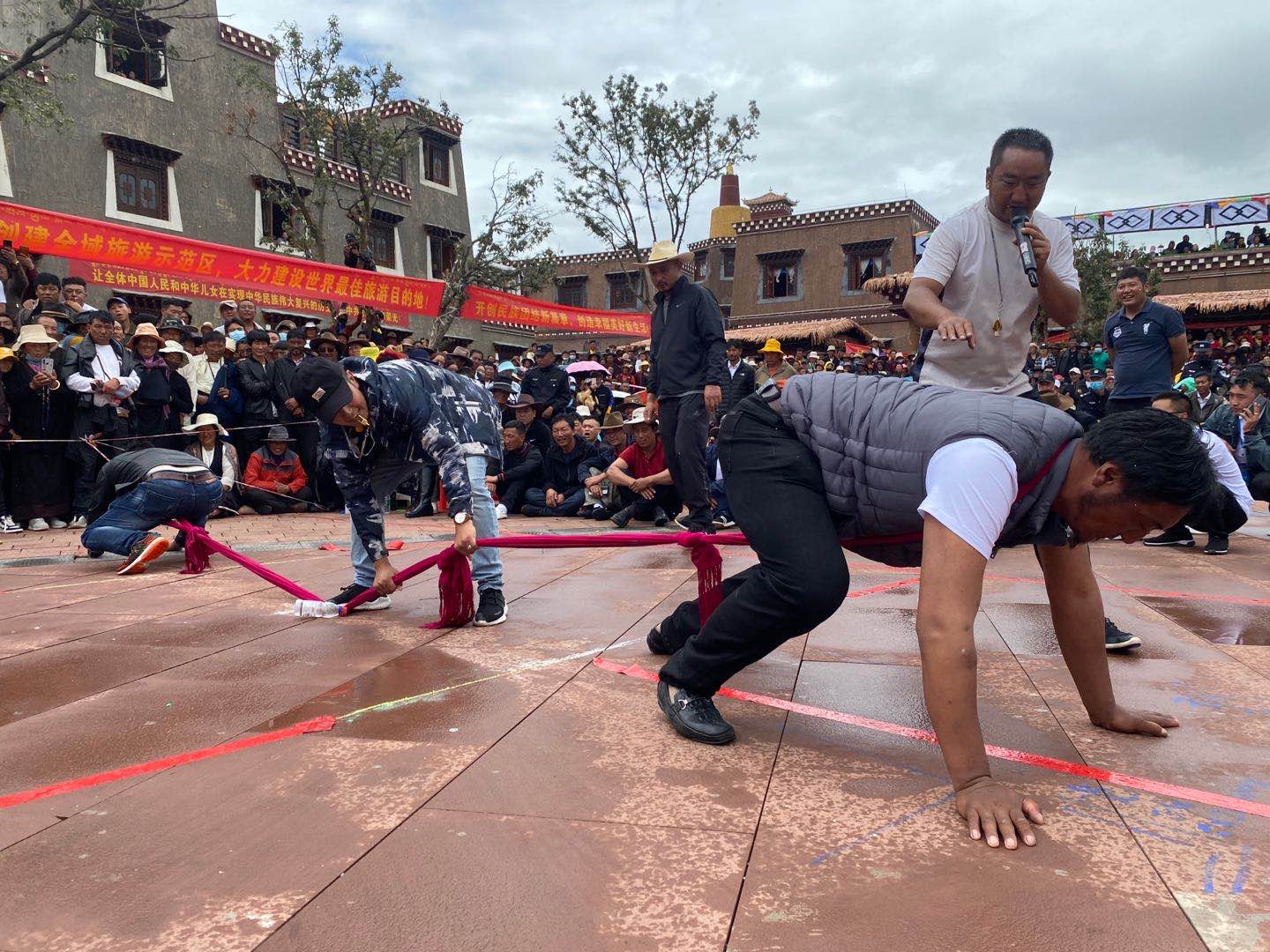 現(xiàn)場兩名運動員俯下身去,脖子上套上同一根長綢布帶,正在做著賽前的準備工作。“嗶——”一聲哨響過后,雙方運動員四肢著地,往相反的方向奮力爬行,布帶隨之被拉直繃緊,賽場氣氛也隨即變得緊張……這種趴著拔河的體育項目叫做格吞,也叫“藏式拔河”。