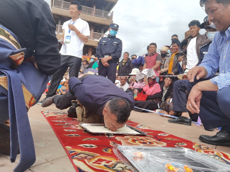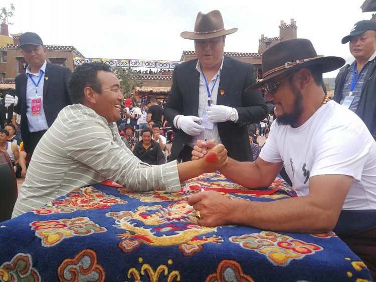 滾桶接力選手們的一次次翻跟斗,穿輪胎更是引得觀眾一次次開懷大笑。緊接著扳手腕、穿藏服揉糌粑、套牛角等游戲一個接一個輪番上陣,現(xiàn)場啦啦隊吶喊助威、熱情高漲,加油聲此起彼伏,讓整個賽場沸騰起來。