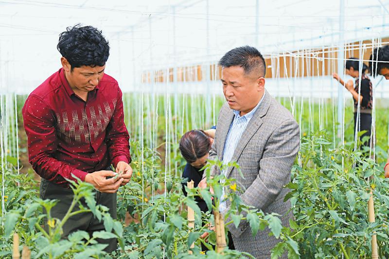 王偉(右)向旦真貢傳授番茄種植技術。 周琳 攝
