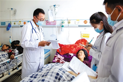 8月12日,玉樹州人民醫(yī)院,王宏偉(左一)在查房中詢問病人病情。