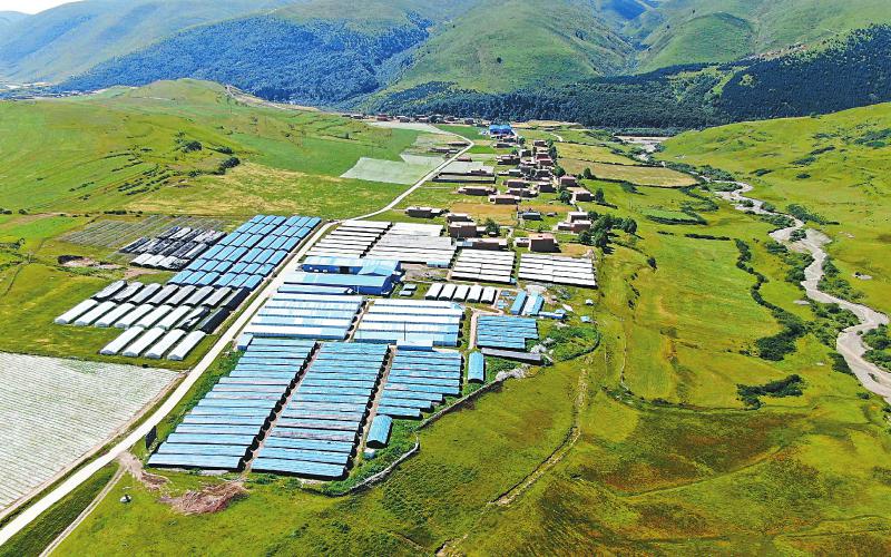 8月19日航拍的阿壩縣高原中低溫食用菌基地。該基地年創(chuàng)產(chǎn)值達(dá)2500余萬元,常年解決貧困農(nóng)牧民就業(yè)200余人。肖雨楊 攝