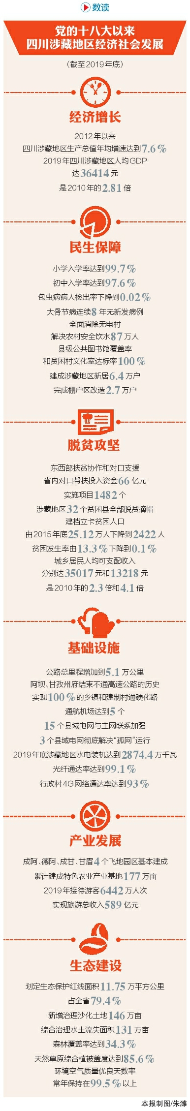 省委涉藏辦相關(guān)負(fù)責(zé)人告訴記者,近年來四川省涉藏地區(qū)加快發(fā)展特色優(yōu)勢(shì)產(chǎn)業(yè),推動(dòng)全域旅游、高原農(nóng)牧業(yè)、清潔能源、民族手工藝等提質(zhì)增效。依托大熊貓、大九寨、大香格里拉、大草原等特色資源,涉藏地區(qū)大力發(fā)展全域旅游,“凈土阿壩”“圣潔甘孜”“大涼山”品牌影響力不斷提升,阿壩州、甘孜州成功創(chuàng)建首批國(guó)家級(jí)全域旅游示范區(qū),2019年接待游客6442萬人次、實(shí)現(xiàn)旅游總收入589億元。涉藏地區(qū)重點(diǎn)發(fā)展高原牦牛、特色果蔬、釀酒葡萄、優(yōu)質(zhì)青稞、道地中藏羌藥材、野生食用菌等產(chǎn)業(yè),基本建成成阿、德阿、成甘、甘眉4個(gè)飛地園區(qū);大力推進(jìn)清潔能源建設(shè),水電裝機(jī)容量達(dá)到2875.6萬千瓦。截至2019年底,四川涉藏地區(qū)人均GDP達(dá)到36414元,是2010年的2.81倍;城鄉(xiāng)居民人均可支配收入分別達(dá)到35017元、13218元,接近全省平均水平,向2020年底實(shí)現(xiàn)全面同步小康邁出了堅(jiān)實(shí)一步。