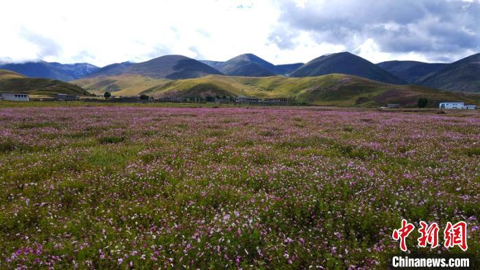 稻城縣噶通鎮(zhèn)八美村位于亞丁機(jī)場前往亞丁景區(qū)的交通要道上。長期以來,這片草原沙化現(xiàn)象日益嚴(yán)重,當(dāng)?shù)卮迕褓囈陨娴膫鹘y(tǒng)放牧都難以為繼。2016年以來,稻城縣利用生態(tài)治理工程實施的契機(jī),整合全域旅游和脫貧攻堅等涉農(nóng)涉旅資金,在沙化草原上大面積種植格桑花,將1599畝沙化草地打造成色拉花海。