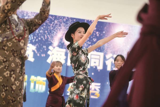 青海省海南州精準扶貧綠色產(chǎn)業(yè)發(fā)展園園區(qū)內(nèi)模特們在展示民族服飾。 邵丹 攝