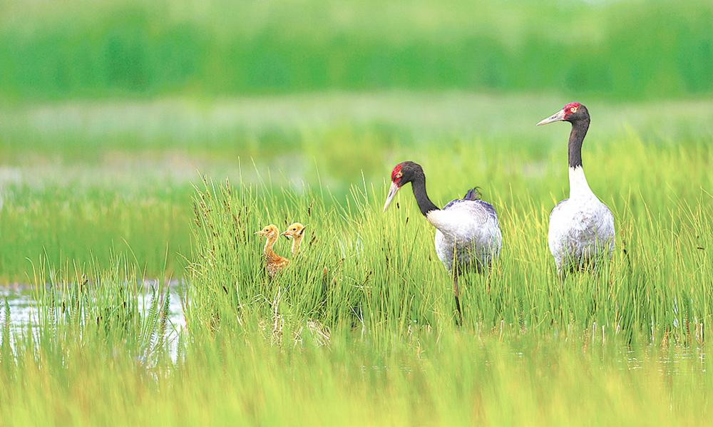 生活在都蘭湖國家濕地公園內的黑頸鶴一家。(9月24日攝)新華網 潘彬彬 攝