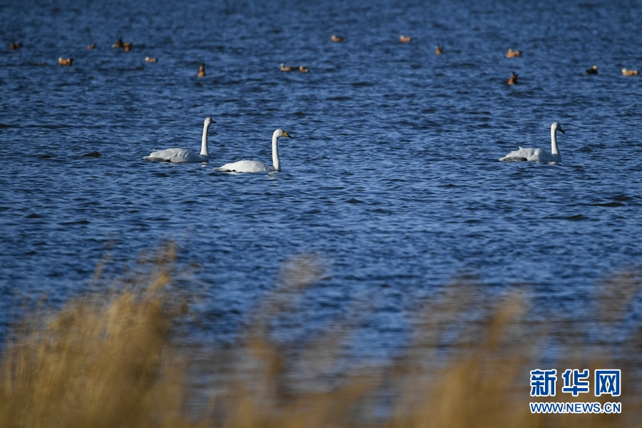 大天鵝、赤麻鴨在都蘭湖游弋。(11月21日攝) 新華網 潘彬彬 攝