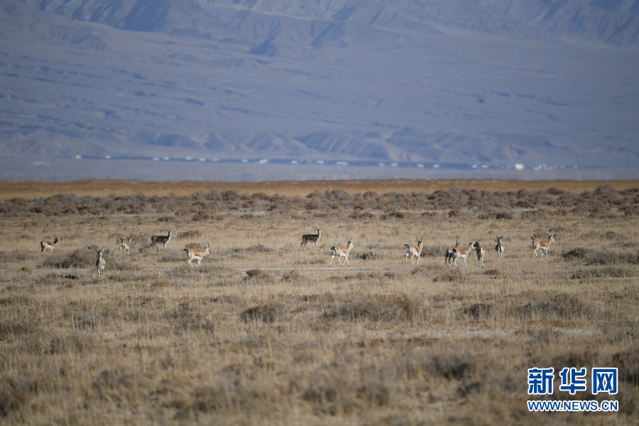 一群鵝喉羚在都蘭湖國家濕地公園內活動。(11月21日攝)新華網 潘彬彬 攝
