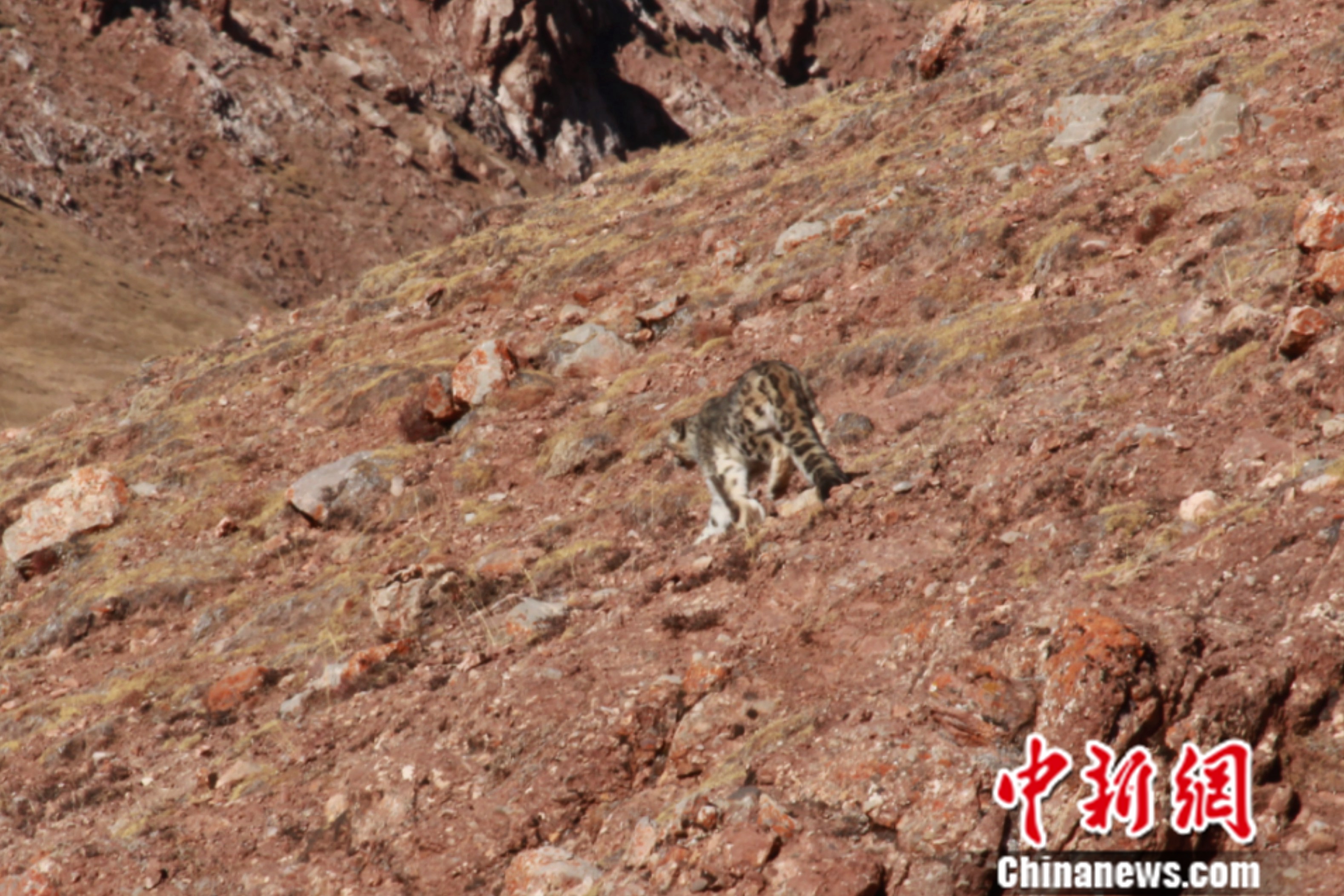 中新社記者看到,羅松扎西拍攝的動(dòng)物臥在山坡上,酷似雪豹,但其皮毛顏色跟金錢豹接近,即呈現(xiàn)棕黃色,遍布斑點(diǎn)和環(huán)紋。