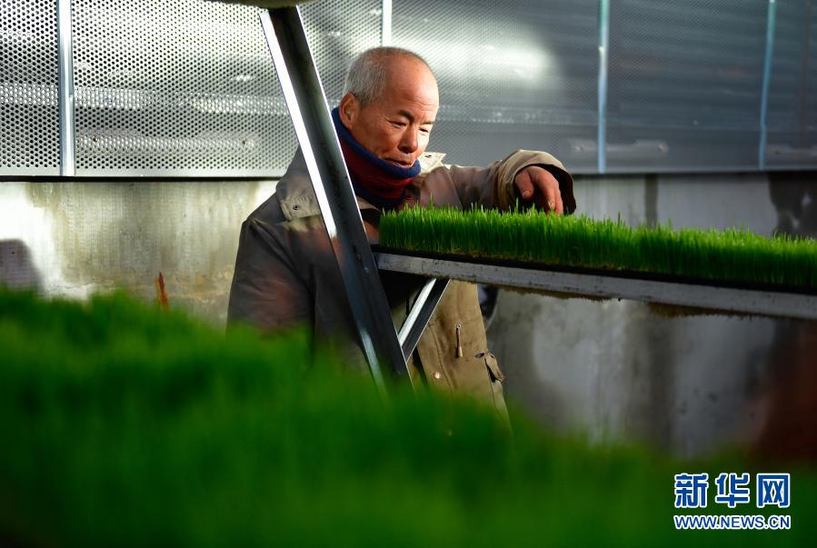 1月13日,在青海省果洛藏族自治州農牧業(yè)生態(tài)科技示范園,工作人員許宗倉在查看牧草生長情況。新華社記者 張龍 攝