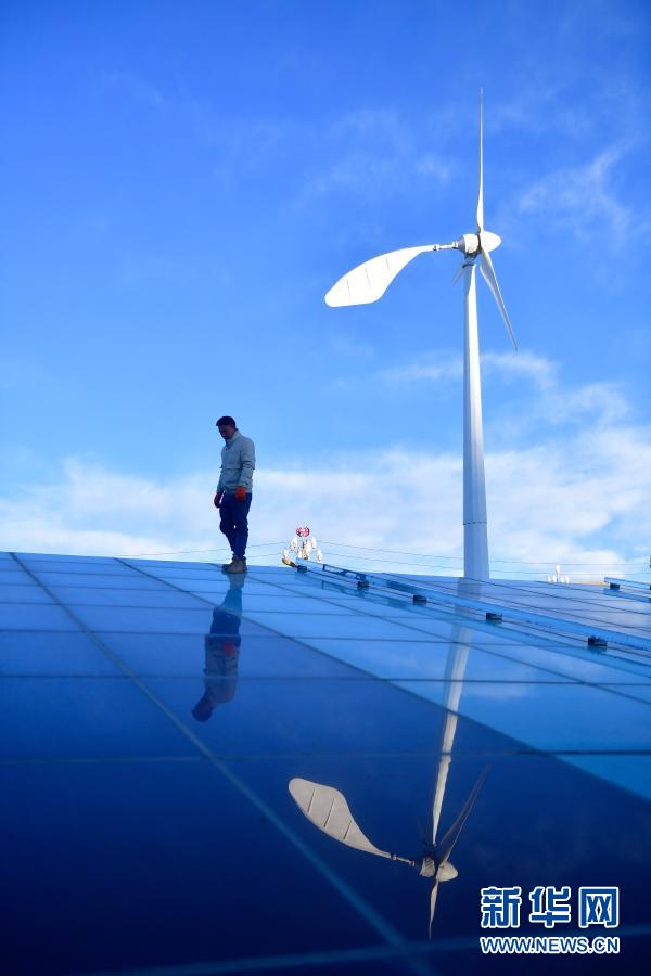 1月13日,在青海省果洛藏族自治州農牧業(yè)生態(tài)科技示范園,工作人員董志強在查看大棚光伏板。 新華社記者 張龍 攝