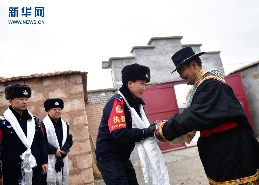 2月5日,沱沱河站派出所巡線民警到格爾木市唐古拉山鎮(zhèn)格日村義務(wù)護(hù)路隊(duì)員革命花(右一)家中慰問時(shí)接受哈達(dá)。新華社記者 張龍 攝