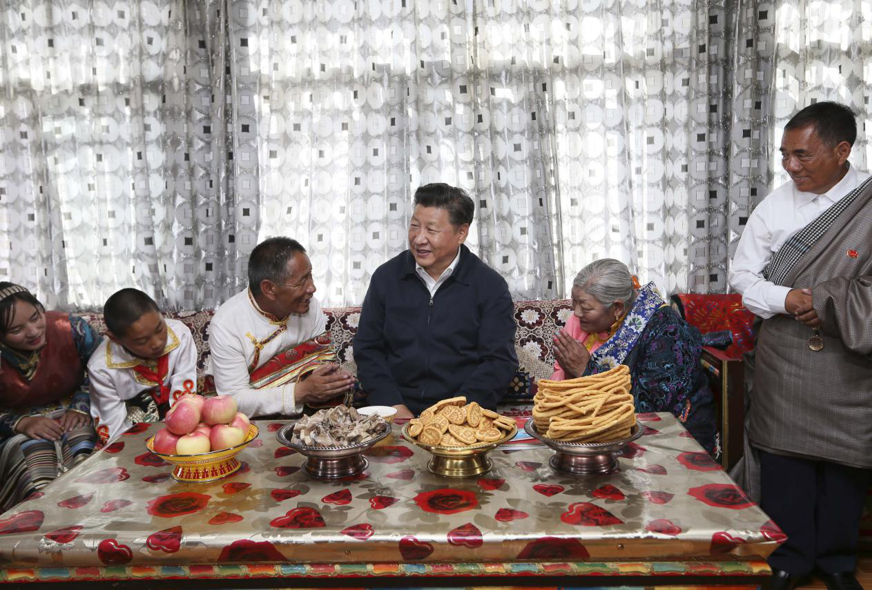 2016年8月22日,習近平總書記在青海省海西蒙古族藏族自治州格爾木市唐古拉山鎮(zhèn)長江源村藏族村民申格家中同一家人親切交談。