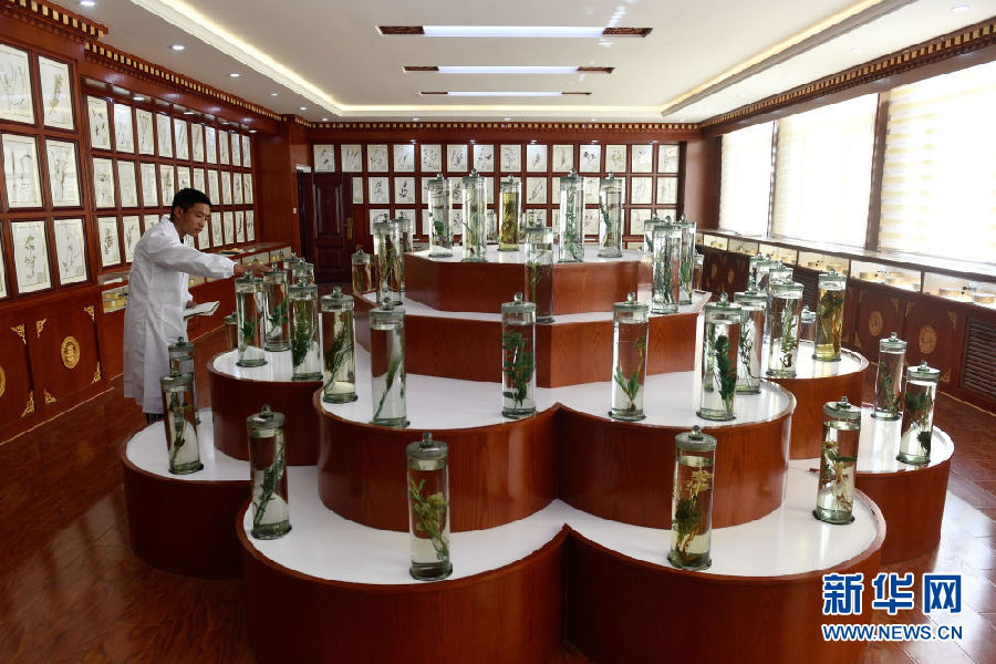 3月16日,在果洛藏族自治州職業(yè)技術(shù)學(xué)校,2020級藏醫(yī)醫(yī)療與藏藥專業(yè)學(xué)生德欽多杰在草藥標本館內(nèi)辨認藥材。新華社記者 張龍 攝