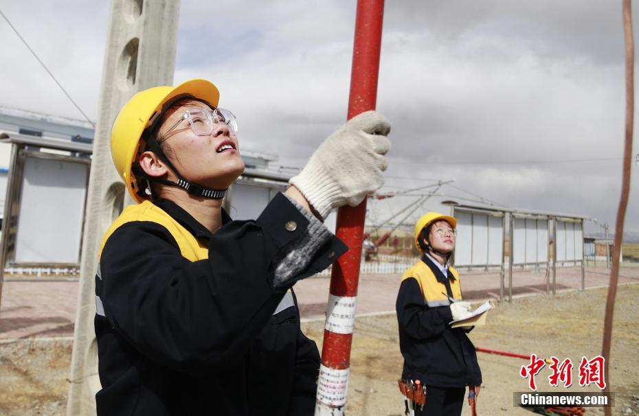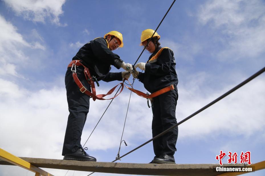 4月13日,青海省海北藏族自治州剛察縣,青藏鐵路公司西寧供電段哈爾蓋工區(qū),羅露露(左)手舉9米多長的地線桿向接觸網上掛地線。中新社記者 馬銘言 攝