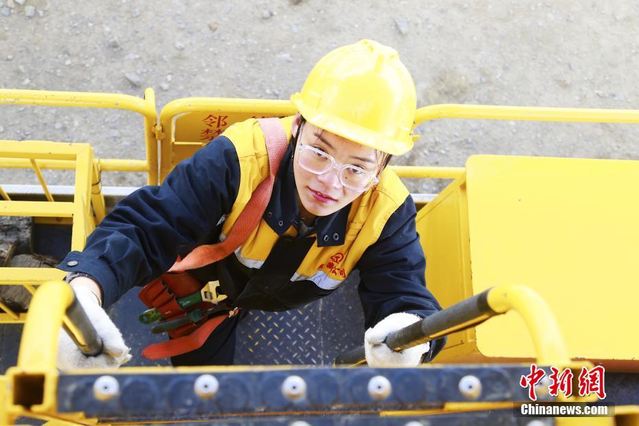 4月13日,青海省海北藏族自治州剛察縣,青藏鐵路公司西寧供電段哈爾蓋工區(qū),羅露露攀爬接觸網作業(yè)車。中新社記者 馬銘言 攝