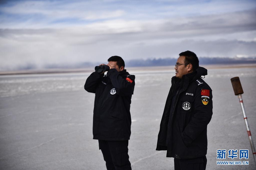 2016年12月1日,袁廣明(右)和隊友在可可西里腹地查看新生湖水位。新華社記者 吳剛 攝