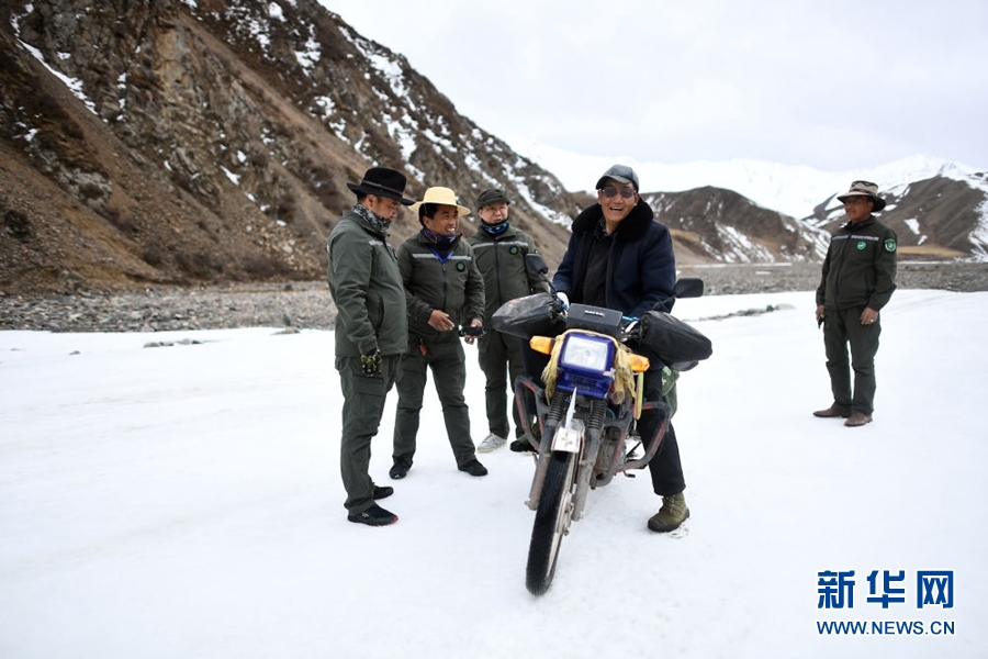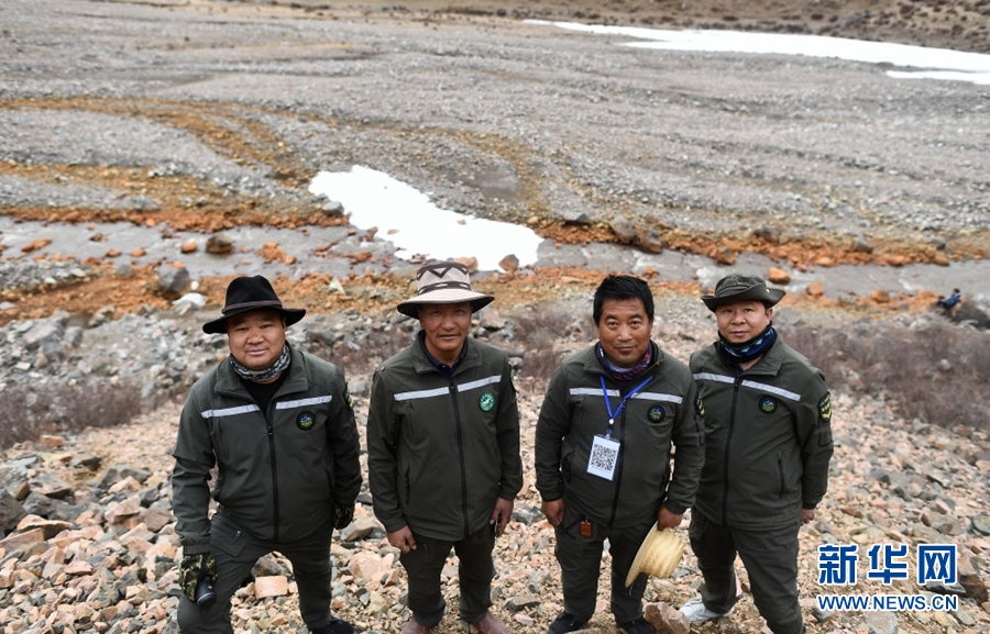 4月22日,祁連山國(guó)家公園油葫蘆管護(hù)站生態(tài)管護(hù)員德康、普華才讓、王學(xué)清、朱江云(從左至右)在巡護(hù)途中合影。新華社記者 張宏祥 攝