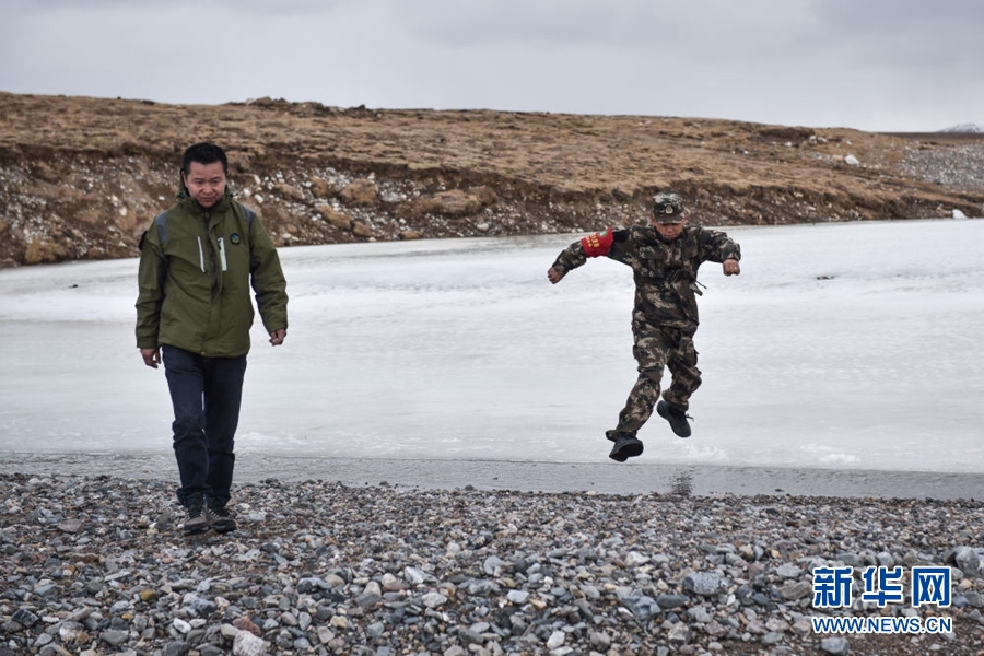 4月23日,祁連山國(guó)家公園沙龍灘管護(hù)站生態(tài)管護(hù)員羅藏次成(右)在巡護(hù)途中跳過(guò)水面。新華社記者 吳剛 攝