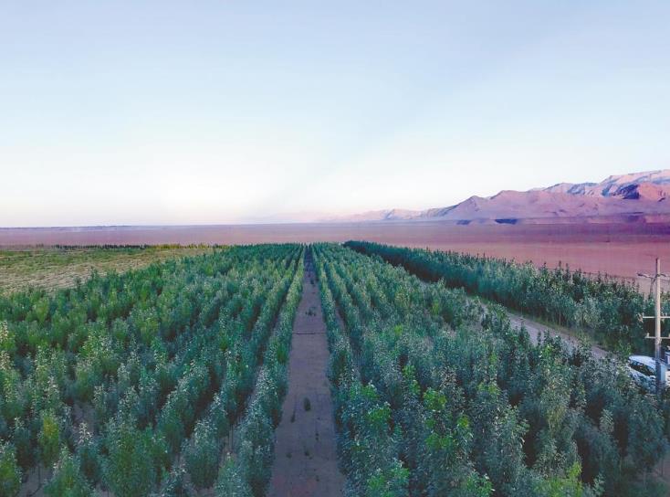 跟隨柴達(dá)木防沙治沙公司員工深一腳、淺一腳地走在治沙基地田埂上,一排排在田間地頭栽植的林木,為農(nóng)田和枸杞林構(gòu)成了一道道擋風(fēng)墻。雖然眼下林木尚在發(fā)芽,到了夏秋時(shí)節(jié)就是滿目蔥郁。