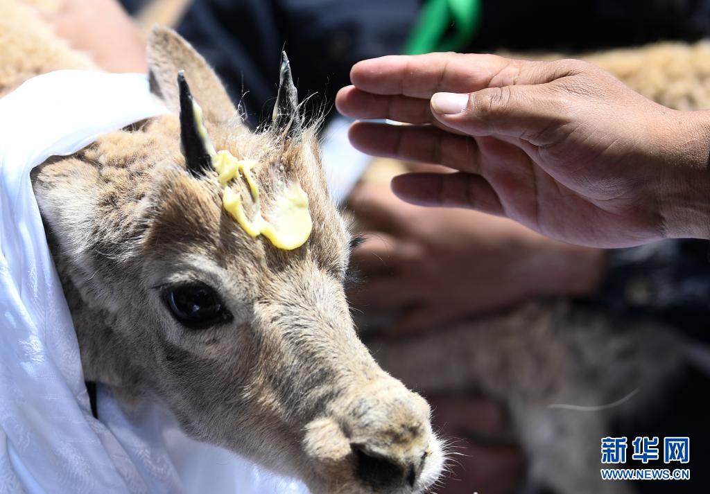7月7日,在可可西里索南達杰保護站野生動物救助中心,可可西里巡山隊員按照風(fēng)俗為放歸的藏羚羊戴上哈達表達祝福。新華社記者 張龍 攝