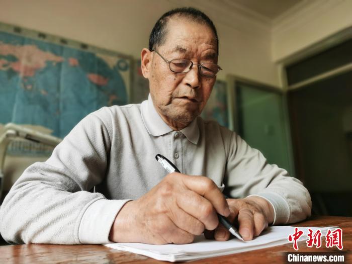 圖為在青海西寧頤養(yǎng)天年的朱汝完向記者展示氣象發(fā)報(bào)基本功。張?zhí)砀?攝