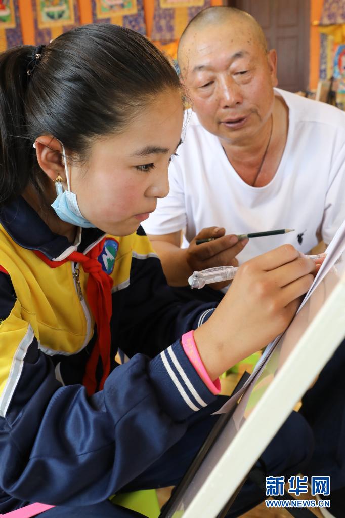 9月2日,黃南藏族自治州同仁市熱貢藝術完全小學六年級學生才讓央宗在唐卡繪畫老師旦巴的指導下畫畫。新華社記者 馬千里 攝