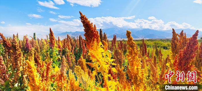 河西農(nóng)場農(nóng)民劉旦智種了30畝藜麥,紅色、白色、黑色的藜麥,在藍(lán)天白云的映襯下,勾勒出一幅高原秋收的美景圖?!敖衲贽见滈L勢不錯(cuò),一畝地大約600多斤,如果每斤按4塊錢算,一畝地可以收入3000多塊錢,經(jīng)濟(jì)效益很不錯(cuò)。我還種了40多畝枸杞,長勢跟去年差不多,1斤能賣20多塊錢?!眲⒌┲歉吲d地給記者算著賬。