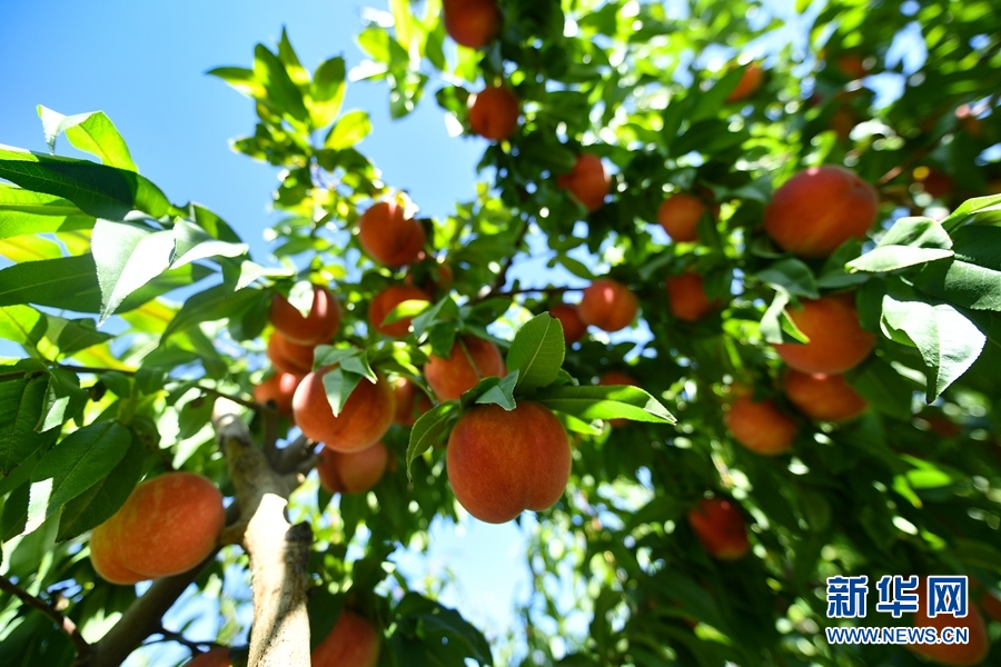 朱聯(lián)產(chǎn)承包的果園內(nèi),成熟的桃子掛滿枝頭。新華網(wǎng) 潘彬彬 攝