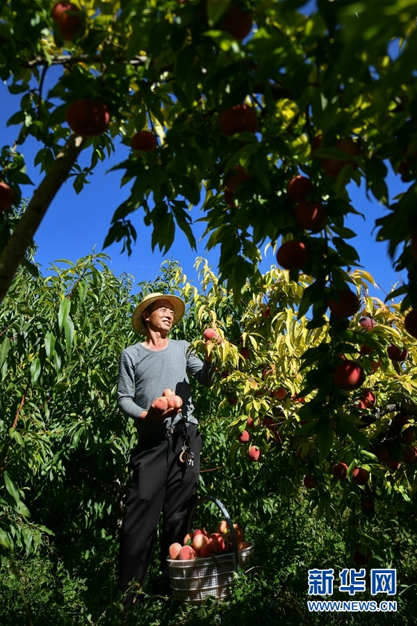9月23日,青海省海南藏族自治州貴德縣河西鄉(xiāng)果農(nóng)朱聯(lián)產(chǎn)在果園內(nèi)采摘桃子。新華網(wǎng) 潘彬彬 攝